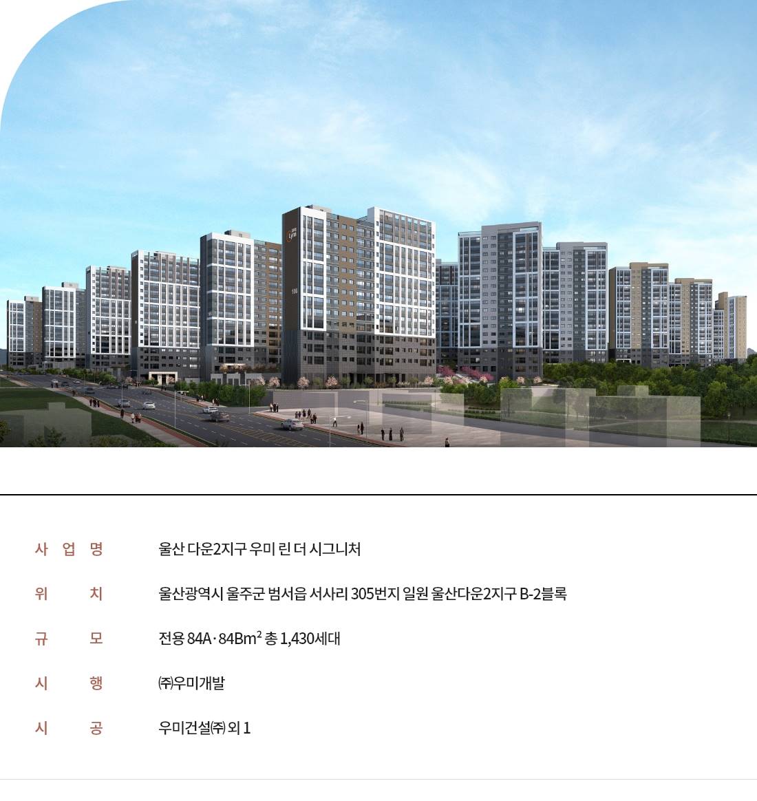 울산 다운2지구 대단지 브랜드 타운 총 731세대로 완성되는 우미린의 주거 자부심 울산 최대 규모 공공택지지구인 다운2지구 내에 위치하여 대규모 브랜드 타운이 주는 주거 시너지와 미래 가치를 선점합니다. 전 세대 전용 84㎡ 단일 평형 구성 실수요자가 가장 선호하는 국민 평형의 혁신 설계 선호도 높은 84㎡로만 구성되어 환금성이 뛰어나며 우미린만의 특화된 공간 설계로 여유로운 생활을 제공합니다. 도보 통학권의 우수한 교육 환경 단지 인근 유치원 및 초, 중, 고교 용지 예정 단지 가까이 교육 시설이 예정되어 있어 아이들의 안전한 통학로 확보와 우수한 교육 인프라를 누릴 수 있습니다. 숲세권과 어우러진 공원형 단지 자연의 쾌적함과 단지 내 조경이 조화를 이루는 주거 지상에 차가 없는 공원형 설계와 주변의 녹지 환경이 어우러져 사계절 내내 쾌적하고 건강한 일상을 선사합니다. 울산 주요 거점을 잇는 쾌속 교통망 울산외곽순환도로 및 다운~성안간 도로 연결 예정 외곽순환도로와 이예로, 국도 14호선 등 울산 도심 및 인근 도시로의 접근성이 뛰어난 사통팔달 교통을 갖추었습니다. 우미린만의 고품격 특화 커뮤니티 실내수영장, 피트니스 등 입주민 전용 시설 실내수영장을 포함한 카페린, 작은도서관 등 입주민의 삶의 질을 높이는 품격 있는 커뮤니티가 조성됩니다. 분양가 상한제 적용의 합리적 가격 공공택지의 혜택을 누리는 경제적인 내 집 마련 분양가 상한제가 적용되어 주변 시세 대비 합리적인 분양가로 내 집 마련과 시세 차익을 동시에 기대할 수 있습니다.